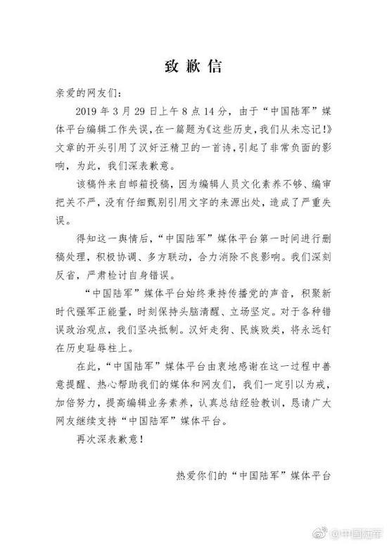 2019年3月29日上午8点14分,由于“中国陆军”媒体平台编辑工作失误,在一篇题为《这些历史,我们从未忘记!》文章的开头引用了汉奸汪精卫的一首诗,引起了非常负面的影响,为此,我们深表歉意。