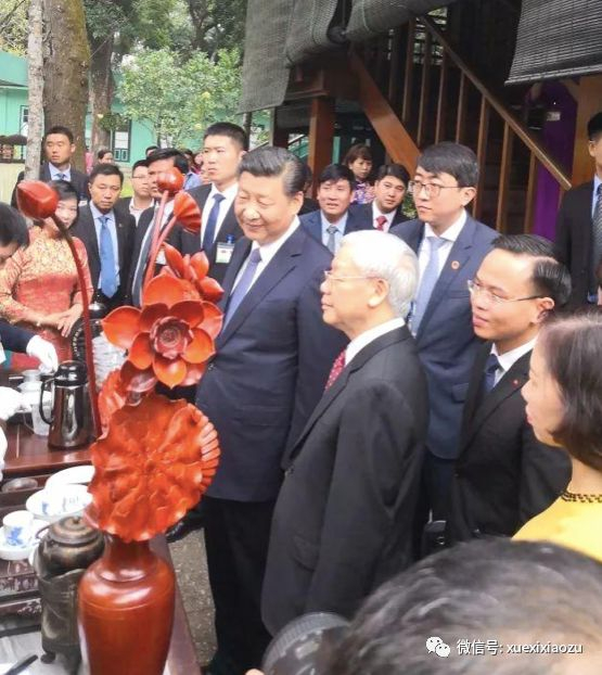 在访问越南期间,习近平与越共中央总书记阮富仲在胡志明故居展开茶叙外交。