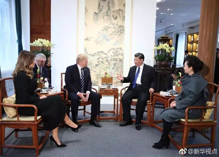 习近平和夫人彭丽媛陪同来华进行国事访问的美国总统特朗普和夫人梅拉尼娅参观故宫博物院。两国元首夫妇在故宫宝蕴楼茶叙。