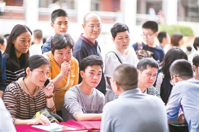 学生及家长们在咨询台前向现场的工作人员咨询自己关心的政策。