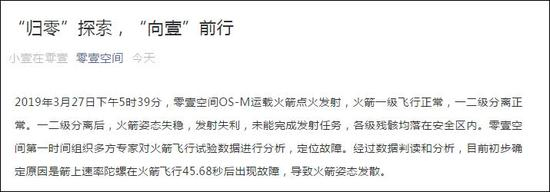 零壹空间表示,对于本次发射任务的失利,我们感到非常遗憾和惋惜,同时衷心感谢这个时代给了我们民营企业探索与尝试的机会,也感谢社会各界一直以来对零壹的支持和鼓励。