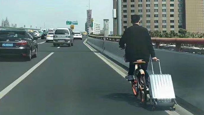 男子骑单车上高架还拖拉杆箱:看着外滩标志骑上去