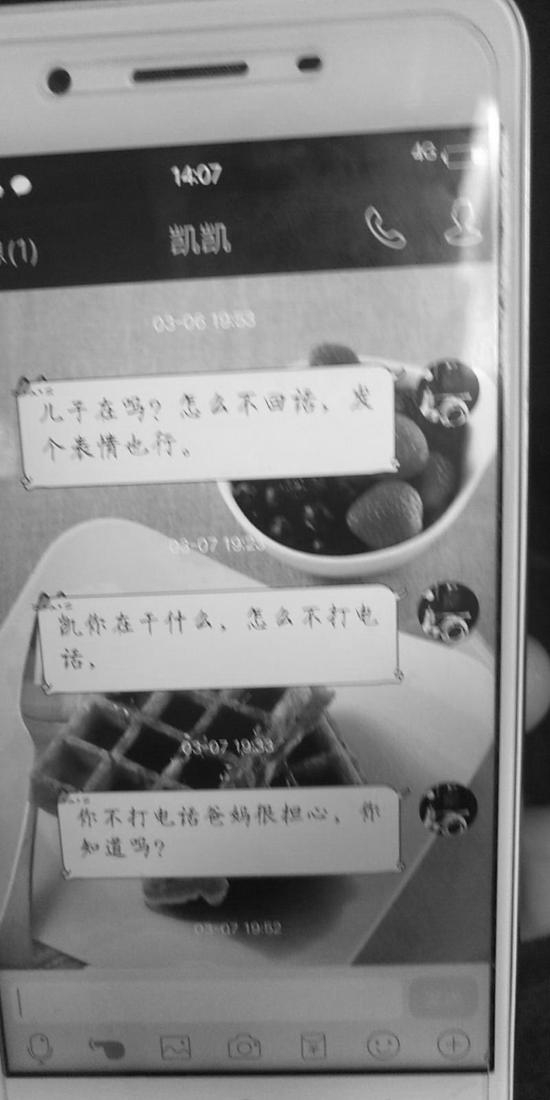 张帅平日里很忙,每次母亲发微信给他,碰上他在出任务,常常是没有回复或很少回复。“儿子在吗,怎么不回话,发个表情也行”“凯你在干什么,怎么不打电话”“你不打电话爸妈很担心,你知道吗”……在张帅和母亲的聊天框里,大多数时候,都是母亲自顾自在问,而张帅的头像那边,缄默无语。