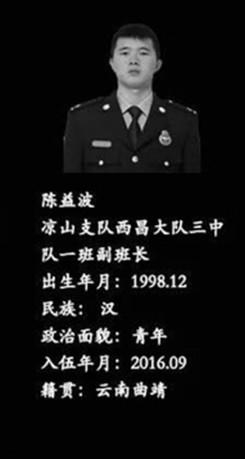 牺牲消防员陈益波,1998年12月出生,来自云南曲靖,未满21周岁。