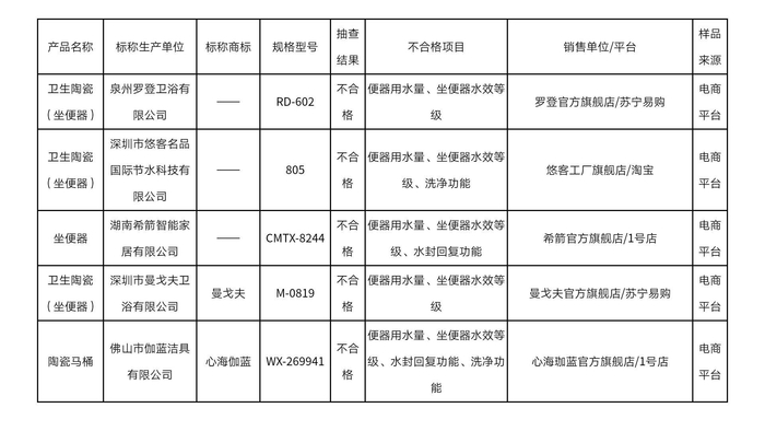 抽查不合格项目为坐便器用水量、坐便器水效等级、水封回复、洗净功能4项指标。本次抽查发现,5批次产品坐便器用水量项目不合格;坐便器水效等级反映了产品用水量的大小,本次抽查中,5批次产品坐便器水效等级项目不合格,存在虚假标高问题;此外,2批次产品水封回复功能项目不合格;2批次产品的洗净功能项目不合格。