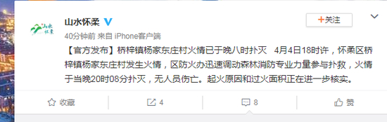 [官方发布]桥梓镇杨家东庄村火情已于晚八时扑灭 4月4日18时许,怀柔区桥梓镇杨家东庄村发生火情,区防火办迅速调动森林消防专业力量参与扑救,火情于当晚20时08分扑灭,无人员伤亡。起火原因和过火面积正在进一步核实。