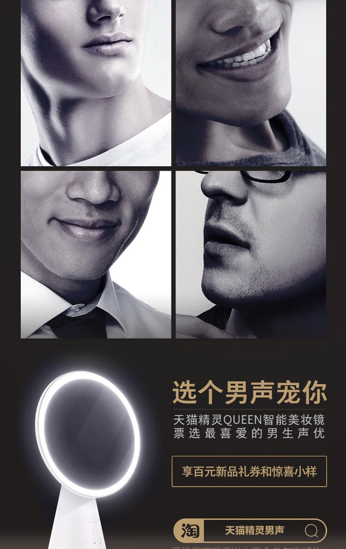 天猫甚至为这款全新的美妆镜举行了“男生声优”票选。阳光大男孩、贴心男闺蜜、温暖男知己、成熟绅士型,哪个类型是你的菜?可以由你投票,选个男声宠你!