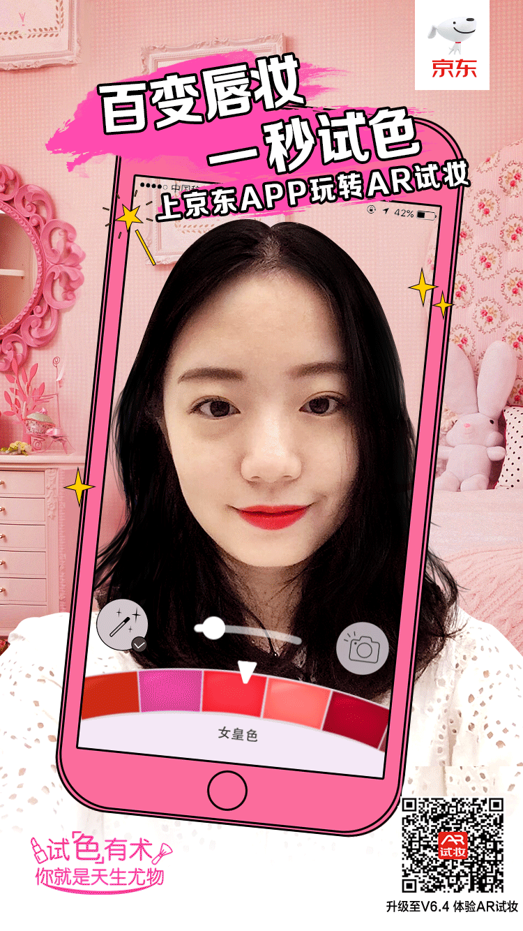 与此同时,欧莱雅又与京东联手,推出了AR试妆功能:打开相应的购买链接,接入端口启动个人手机中的相机功能,就可以在几秒钟内完成口红试色,选中配色后直接点击购物车,即可完成整个线上采购过程。试色的过程让你好看到简直停不下来,体验过“线上试色”的女生们不免感慨:“一入AR深似海,从此柜姐是路人。”