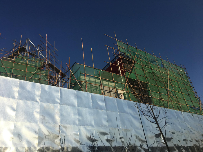 近日,新京报记者来到中海·望京府的建设工地实地探访。东北五环外,紧邻地铁15号线以南,观唐东路东侧,高高的围挡将工地遮得严严实实,但可以看到一幢楼已基本成型,“冒”出围挡,工人正在楼顶赶工作业。记者获悉,这是中海·望京府在4月中旬即将开放的样板间。