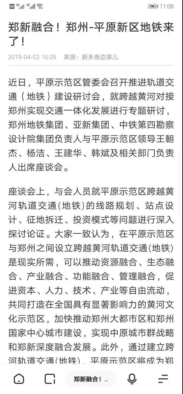 近日,多家自媒体发布文章称:“4月1日上午,平原示范区管委会召开推进轨道交通(地铁)建设研讨会,就跨越黄河对接郑州实现交通一体化发展进行专题研讨,会议就平原示范区跨越黄河轨道交通(地铁)的线路规划、站点设计、征地拆迁、投资模式等问题进行深入探讨论证”,并将其解读为“郑州和平原新区之间将要通地铁”。
