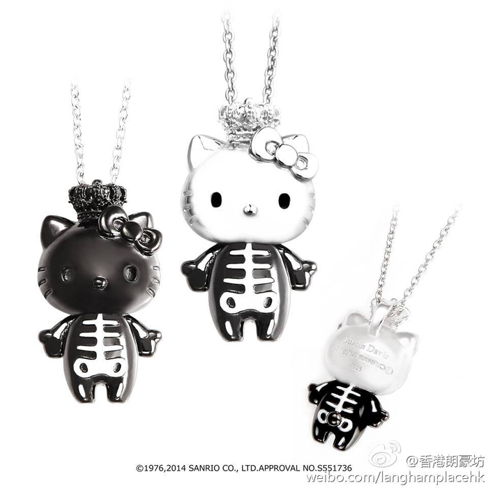 “恐怖萌”了解一下?2014年是Hello Kitty诞生40周年,融合波普艺术风、好莱坞华丽风及摇滚朋克文化的日本JUSTIN DAVIS饰品品牌借机推出了黑白款骨骼吊坠。