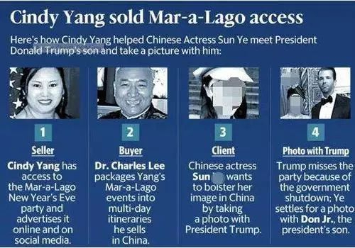 文中还举例说,一个孙姓中国女演员就通过查尔斯·李和辛迪·杨走进了海湖庄园,并和特朗普多位亲属合了影。