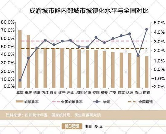 2018年,四川和重庆的地区生产总值合计超过6万亿元。成渝城市群人口和经济总量都分别占川渝两地总和的90%左右。2014年,成渝城市群地区生产总值占全国的5.49%,而2018年这一比例已经提升至6.6%左右。