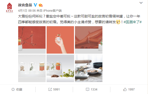 4月1日,故宫食品微博晒出了六张“可甜可盐”的故宫初雪调味罐图片,去故宫看雪一直被认为是一件很美很浪漫的事,而今,一个调味罐就能满足所有想象,网友对此好评不断:“这么好看的调味罐都不舍得用。”“当水晶球也可以。”