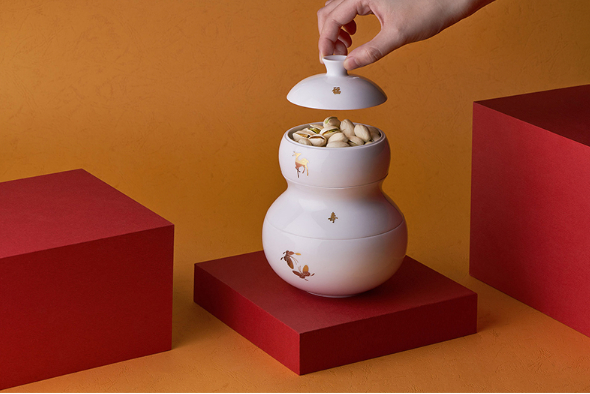 独特外形加上美好寓意,自然成为被追捧的对象。这款食盒是一个葫芦的外形,造型浑圆优雅。食盒共分为四层,分别对应“福”“禄”“寿”“喜”,同时,外壁上印有对应的贴金动物图案,分别是蝙蝠、瑞鹿、仙鹤、蝴蝶。