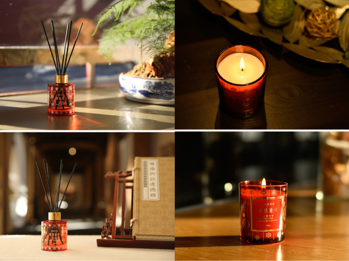 扩香香氛和香薰蜡烛外观都以红色为主色调,前调有佛手柑、柑橘两种,中调有松木、琥珀两种,后调有水仙、腊梅、百合三种,清冽不俗的香气中带着一份优雅。