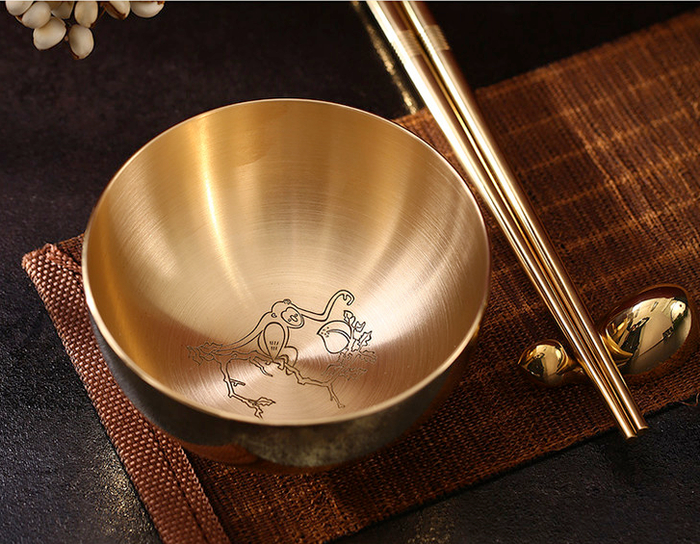 这套“金饭碗”有着活泼可爱的猿猴图案,充满着童真、童趣,产品灵感来源于故宫博物院收藏的宋代《宋人画猿猴摘果图》。金色的碗底画着生动的图案,可以吸引孩子的注意力,一只猿猴右臂抓树,左臂摘取果子,再搭配上如意金箍筷,孩子不爱吃饭还是问题吗?
