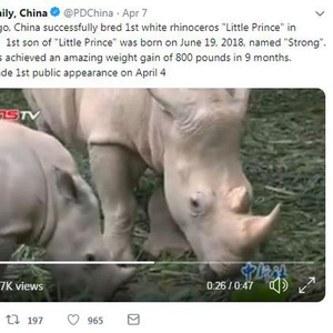 不要小看这两只白犀牛,自4月7日在人民日报推特上亮相后,它们已收获了近5万点击和近千点赞。