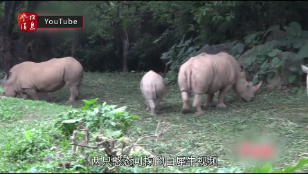 视频中,两只憨态可掬的白犀牛在草地上悠闲地散步、进食,偶尔动动耳朵,甩甩尾巴……