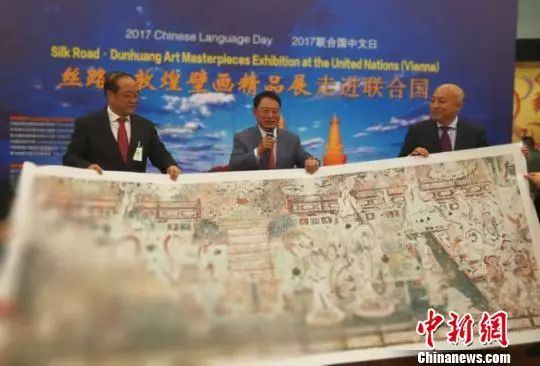资料图:2017年5月8日,2017联合国中文日活动“丝路-敦煌壁画精品艺术展走进联合国”展览在维也纳联合国大厅开幕。敦煌研究院向联合国机构赠送了敦煌壁画高保真复制品。 张伟文 摄