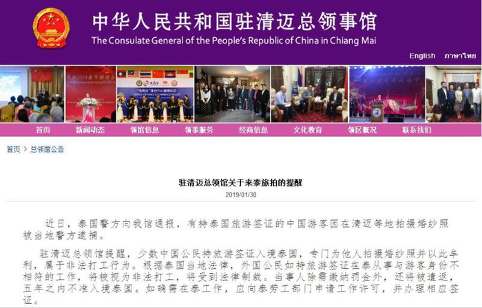 中国驻清迈总领事馆对来泰旅拍的提醒
