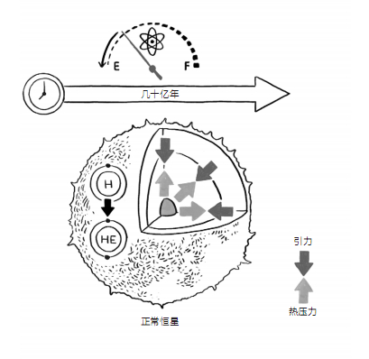 DS:美国航空航天局用高压锅来比喻恒星。恒星内部的核聚变的爆炸力产生了向外的压力,将一切都往内拉的恒星自身引力把这压力约束在恒星内部。