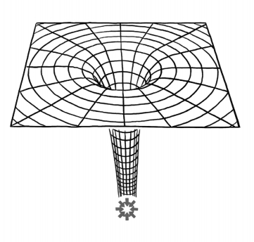 DS:爱因斯坦的广义相对论认为,物体使围绕它们的时空变形。想象放在一张蹦床上的一个保龄球,它会改变蹦床布料的形状,使得其他较小的物体朝它滑去。人们通常用这种办法来比喻和理解引力效应。倘若时空的弯曲程度越来越厉害,最终变成无限大,在此处我们日常所熟知的时空规则就不再适用。