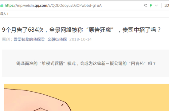 全景网络在新三板挂牌,其商业模式被质疑为“套路营销”,自媒体大号们更称其为原告狂魔。