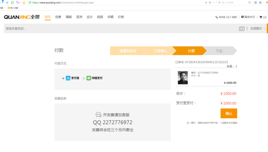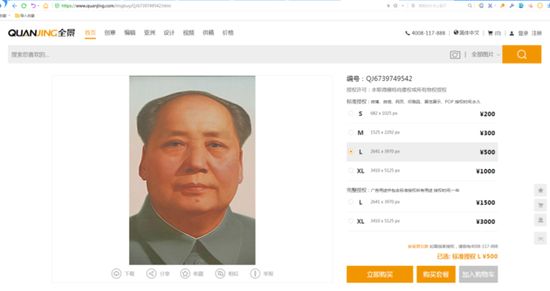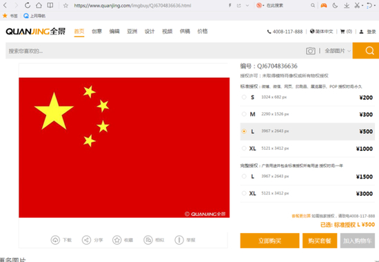 《每日经济新闻》发现,“全景”网站上面国旗、党旗、伟人肖像等图片信息当中的授权许可,明确写着“未取得模特肖像权或所有物权授权”或“未知’,但仍可在线支付,“标准授权”价格从200-1000元不等,“完整授权”有1500元、3000元两种价格。