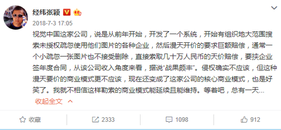 去年7月3日,微博认证经纬中国创始管理合伙人张颖发文批视觉中国,称其有组织地大范围搜索未授权疏忽使用他们图片的各种企业,然后漫天开价的要求巨额赔偿,通常一个小疏忽一张图片也不接受删除,直接索取几十万人民币的天价赔偿,要挟企业签年度合同。