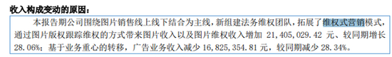 当然,“维权式营销模式”立刻带来了丰厚的回报,财报显示图片维权收入增加了2100多万。