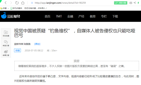自媒体蓝鲸传媒称,视觉中国被质疑“钓鱼维权”,自媒体人被告侵权也只能吃哑巴亏。