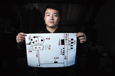 2月27日,上海,王永福拿着根据自己丢失前对家及家周边的情况而画的示意图。