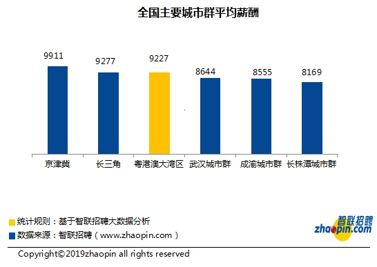地区的薪酬水平是决定其人才吸引力的重要因素之一。智联大数据显示,2019年春季,粤港澳大湾区总体平均薪酬为9227元/月,在全国主要城市群中排名第三,与排第二的长三角城市群薪酬水平相差不大,薪酬水平高于武汉城市群、成渝城市群等。