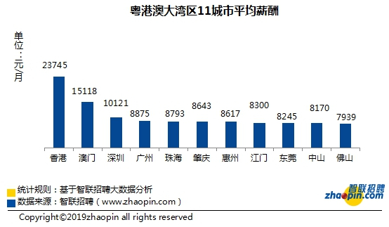 从11个城市来看,各地的平均薪酬排序与其经济发展水平大体吻合。经济最发达的香港平均薪酬领跑湾区,为23745元/月。澳门和深圳处于第二梯队,平均薪酬均在1万元/月以上。其他城市平均薪酬在8000-9000元/月的区间内浮动。值得注意的是,肇庆的薪酬水平较高(8643元/月),超越东莞、佛山等地,仅次于珠海。