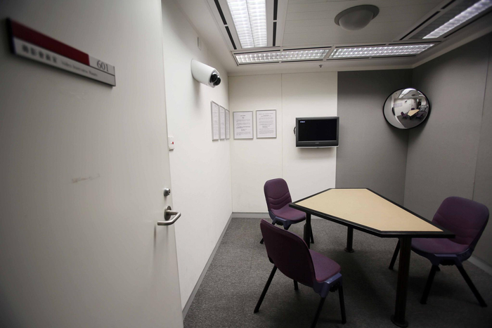 在港片中常出现的录影会面室也不像很多电影中展示的那么幽暗逼仄,也不会有高亮度台灯和令人寒战的冷气。在空间不大的会面室中,室内三台摄像机同时启动,三盒录像带一盒在疑犯面前密封,需要时用作“呈堂证供”,一盒交给疑犯本人,一盒留工作人员做调查用。