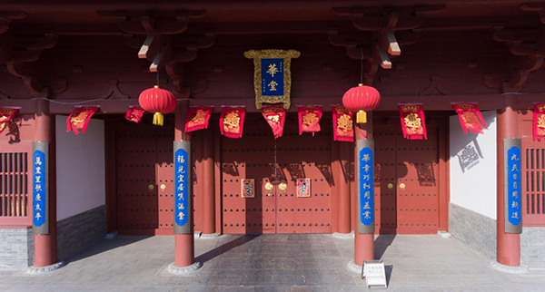 2月20日,澎湃新闻记者来到位于天津市武清区的华堂。冬末时节,华堂周边人烟稀少。整个园区由3米左右高的红色墙壁环绕,仅在南侧、西侧设有两道入口。记者到访时,南侧的主门正紧闭着。门口柱子上有“万里笙歌庆太平”“福苑宜居咲满堂”等四句题诗,写有“华堂”二字的牌匾高悬正中,落款显示其由一位何姓人士题于“壬辰金秋”(即2012年秋季)。