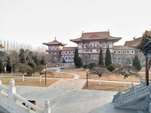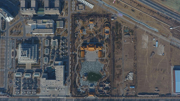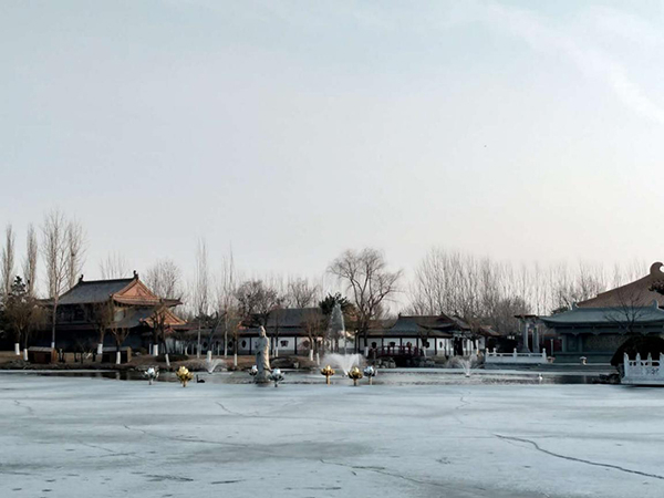 记者进入华堂后发现,华堂的整体形状呈长方形。其内部中央位置是一座结冰的人工湖,湖中建有湖心岛、观景亭、莲花状喷泉及观音塑像。在园区中轴线上与入口隔湖相望的,是一栋3至4层高、坐北朝南的仿古建筑。此外在园区北部还分布着三栋较小的殿宇。