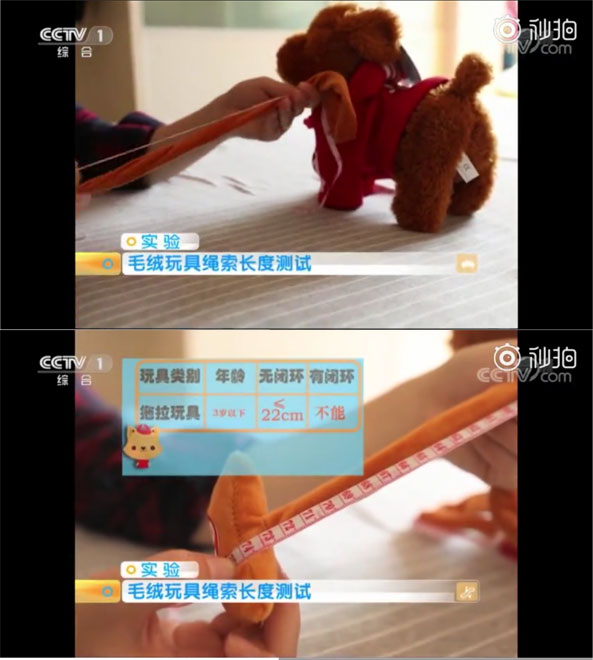 近日,央视报道某些毛绒玩具的绳索长度太长,存在安全隐患。据北京消费者协会秘书长杨晓军介绍,18个月以下的儿童玩的普通玩具中,绳索和弹性绳自由拉伸的长度不应超过22厘米,如果绳子和玩具上任何一个环扣形成了闭环,拉伸的时候周长不应超过36厘米。