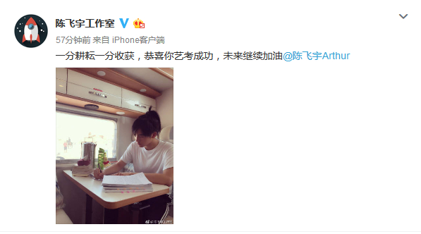 新京报讯 4月15日,陈飞宇工作室宣布其已被北京电影学院表演系录取的消息,称“一分耕耘一分收获,恭喜你艺考成功,未来继续加油。”并随文配发了一张陈飞宇在拍摄间隙复习功课的工作照。