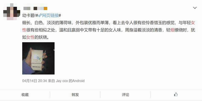 吸烟也被人为地与一些气质联系起来。“细长、白色、淡淡的薄荷味,外包装优雅而单薄,看上去很有些怜香惜玉的感觉,与年轻女士很有相似之处,温和且赢(羸)弱中又带有十足的女人味……轻烟缭绕时,犹如女性的妖娆”,一名微博用户发出了上述推荐语,并贴上一张手持某香烟的照片。