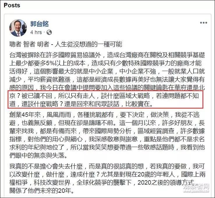 16日中午12点,郭台铭在其脸书账号上写了段长文,里面提到上述对话过程,再次抨击民进党“连问题都不知道,还谈什么战略?”