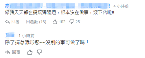 也有网民痛批蔡英文炒作“统独”议题,“根本没在做事,滚下台啦”↓