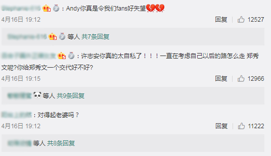 此次“安心偷食事件”被曝光后,事件在香港及内地都引起议论。在许志安的微博账号上,有不少网友在其道歉文章下评论指责↓