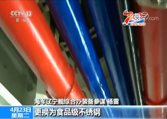 海军辽宁舰综合办装备参谋 杨雷:在坞修期间我们也更换了全舰的冷热水管路,由以前的普通不锈钢更换成食品级不锈钢,这样就极大地提高了饮用水品质,同时加装了两台海水淡化深度处理装置,这样就极大地改善了大家的生活保障设施条件。