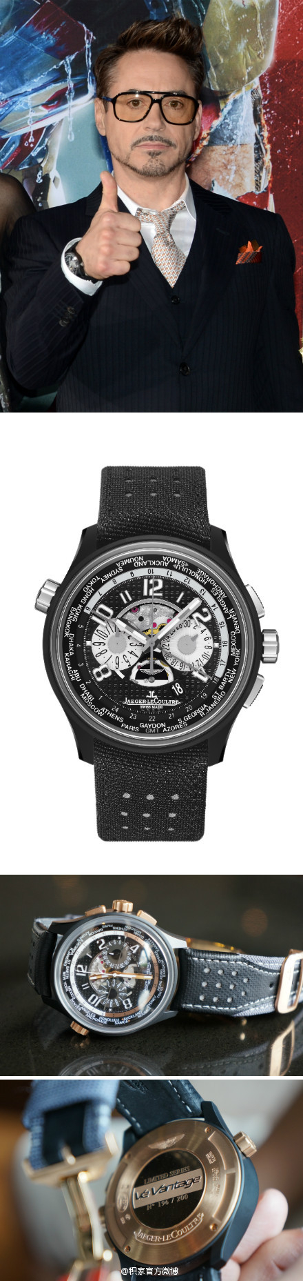 《钢铁侠3》洛杉矶首映式,小罗伯特·唐尼佩戴的积家Amvox 5阿斯顿·马丁世界时区计时腕表,全球限量300枚。 图片来源/积家官微