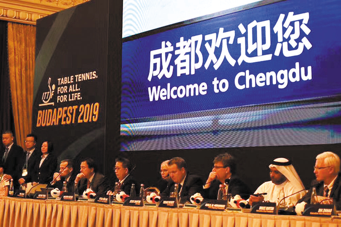 在国际乒联年度大会上,成都向全世界郑重承诺,我们有信心、有决心、有能力办好2022世乒赛,欢迎世界各国朋友届时到大熊猫的故乡中国成都来,一起见证一届高品质的世界乒乓球盛会。(记者 陈浩 文/图 )