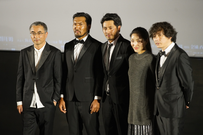 左起:导演万玛才旦、演员金巴、更登彭措、索朗旺姆以及录音师德格才让分享拍摄经过。