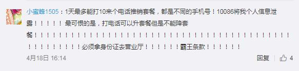 中新经纬客户端发现,早在此前中国移动宣布上述决定时,就有网友喊话中国联通。有网友表示,“这个举措从运营商这发出来还是算给力的”,另有网友询问举报途径。不过,也有网友不买账,表示中国移动就是最大的骚扰方,甚至有网友直称中国移动“霸王条款”,降套餐只能拿身份证去营业厅。