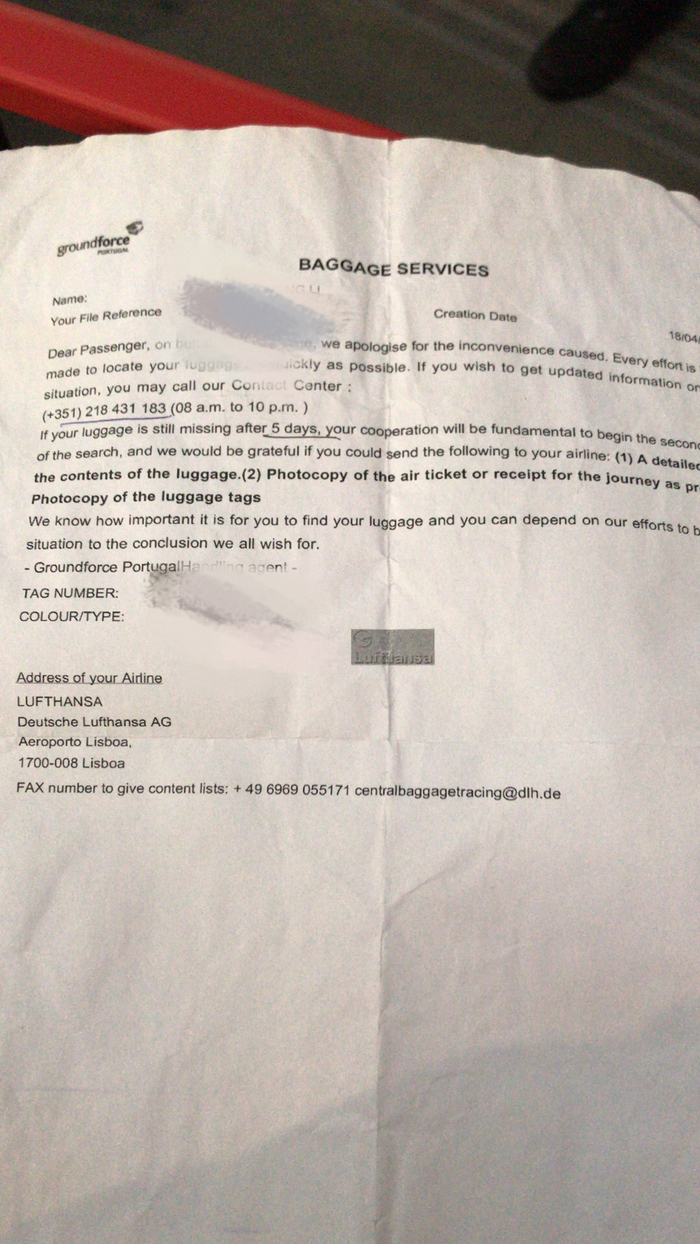 4月18日,李女士乘坐汉莎航空LH723航班转LH1792航班,自北京首都机场经慕尼黑机场转机到达里斯本机场。到达里斯本后,李女士发现行李未到达,询问机场行李丢失处工作人员后,得知汉莎航空信息显示其行李落在了中转机场慕尼黑,汉莎方面并给李女士开具了遗落行李处理单,称4月19日上午会有专人将行李送至李女士所在酒店。4月19日,李女士仍未收到行李,返回里斯本机场询问时被告知已经没有任何行李位置信息,此时汉莎航空也未联系李女士说明情况。